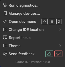 - Report issue - opens a page in the Radon IDE GitHub repository where you can submit issue reports and suggest features,